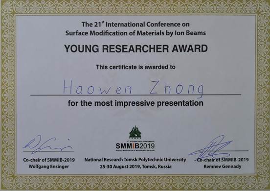 在2019年8月25日至30日于俄罗斯托木斯克市举办的第21届国际离子束材料表面改性大会(The 21th International Conference on Surface Modification ofMaterials by Ion Beams, SMMIB 2019)上,必赢76net线路官网强脉冲粒子束实验室的博士生钟昊玟同学同来自俄罗斯、法国和南非的5名青年学者一道获得了本次会议的青年研究者奖。