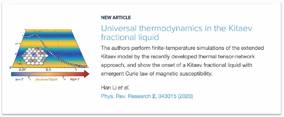 近日,我院微纳物理与应用研究室理论团队(以下简称研究团队)在Kitaev量子磁体的多体理论研究中取得进展。通过采用课题组发展的指数张量重正化群方法,研究团队考虑了Kitaev磁性材料中广泛存在的相互作用项,并对这样的扩展Kitaev模型进行了大尺寸量子多体热力学模拟,在中间温区发现了奇特的分数液体态(或称近邻自旋液体态),并发现其具有马约纳拉激发和新奇的普适热力学规律。具体地说,在分数液体中,磁化率呈现出不同于高温居里-外斯定律的演生(emergent)居里-外斯行为;比热呈现出对应于马约纳拉金属的线性行为;自旋结构因子呈现条纹状背景,反映了系统中独特的自旋关联模式。这些特征共同刻画了新颖的Kitaev分数液体态和Kitaev顺磁规律。相关工作于2020年10月2日以“Universal thermodynamics in the Kitaev fractional liquid”为题在线发表于Physical Review系列新期刊《Physical Review Research》,北航必赢76net线路官网博士生李涵为第一作者,龚寿书教授、李伟副教授为通讯作者,北航必赢76net线路官网为第一作者和通讯作者单位。合作者还包括北航必赢76net线路官网硕士研究生屈代维,本科生张皓凯(现在清华大学高研院攻读博士学位),复旦大学戚扬教授(通讯作者)等。