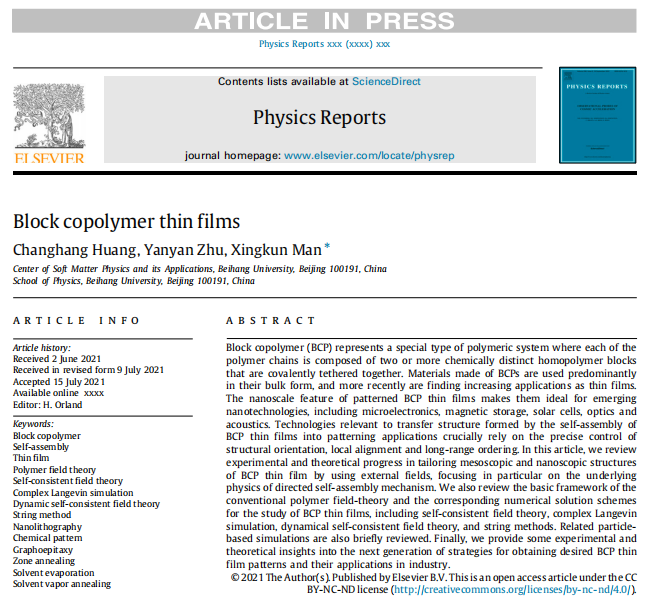 近日,北航必赢76net线路官网满兴坤教授团队在物理学著名综述期刊《Physics Reports》(影响因子:25.6)上发表题为《Block Copolymer Thin Films》的综述文章。北航必赢76net线路官网博士生黄昌杭和朱艳艳分别为第一和第二作者。北航满兴坤教授为唯一通讯作者,北航必赢76net线路官网为通讯作者单位(文章链接:)。