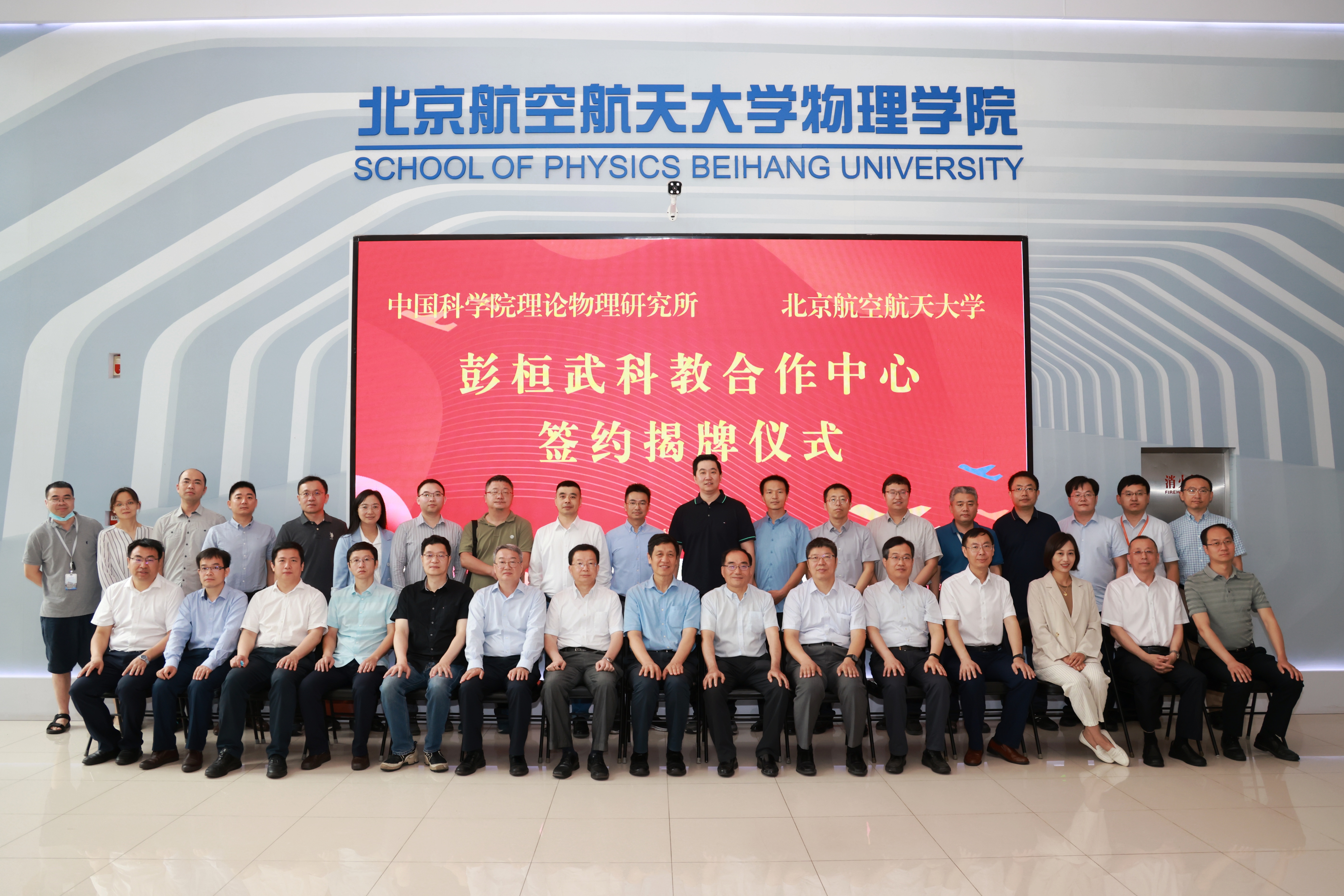 黄海军和王延颋分别代表北航和理论物理所签署战略合作协议。徐惠彬、黄海军、蔡荣根、邹冰松共同为彭桓武科教合作中心揭牌。
