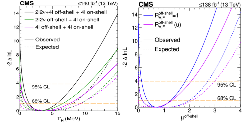 左图:实验上观测到的希格斯粒子宽度的似然值扫描结果。 右图: 实验上观测到的希格斯粒子离壳事例信号强度的似然值扫描结果。