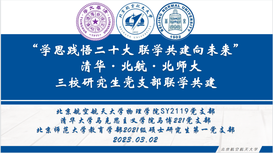 为深入学习贯彻党的二十大精神,进一步加深同学们对党的二十大的精神实质、核心要义的认识,近日,北航必赢76net线路官网SY2119党支部联合清华大学马克思主义学院马博221党支部、北京师范大学教育学部2021级研究生党支部开展联学共建活动,深入学习二十大报告。本次活动在三校分设会场并同步开展。