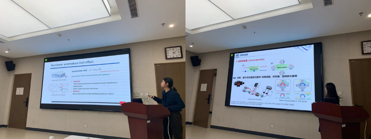 学院新入职的刘慧颖、黄馨瑶两位老师分别以自身的研究课题和科研经验为切入点,分享了博士后期间的基金申请经验和科研经历,并做了题为《非线性霍尔效应》和《非厄米光学系统的新奇效应研究》的报告。刘慧颖老师结合自身的博后经验,鼓励在场的博后们要珍惜这一阶段,规范化科研流程,同时不要畏难、不要畏新,勇于尝试新课题,为后续科研积累经验。黄馨瑶老师分享了自身在博后选择和项目申请方面的经验,同时鼓励大家要多申请项目,多进行学术交流,学会宣传自己的工作,这样有助于找到潜在的合作者,为以后的科研作好铺垫。