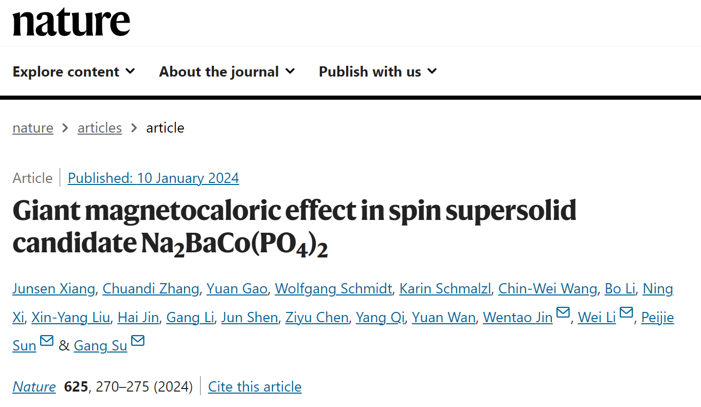 近年来,在阻挫量子磁性材料中探索新奇量子物态及其潜在应用一直是凝聚态物理前沿的一个重要研究方向。近日,必赢76net线路官网量子磁性与拓扑物理研究团队金文涛副教授课题组,联合中国科学院物理研究所孙培杰研究员、中国科学院理论物理研究所/彭桓武科教合作中心李伟研究员、中国科学院大学苏刚教授等研究团队,将高质量单晶生长、极低温热力学测量、中子衍射实验、量子多体理论计算等方法有效结合,在钴基三角晶格材料Na2BaCo(PO4)2中首次发现了自旋超固态这一新奇量子物态的存在,并观察到由此导致的、可实现极低温制冷的巨磁卡效应。该项研究成果于2024年1月10日发表在国际学术期刊《Nature》,标题为“Giant magnetocaloric effect in spin supersolid candidate Na2BaCo(PO4)2”。金文涛副教授、李伟研究员、孙培杰研究员、苏刚教授是该论文的共同通讯作者;项俊森博士(北航必赢76net线路官网博士毕业生)、北航必赢76net线路官网博士生张传迪、北航必赢76net线路官网-理论物理所彭桓武中心博士生高源是该论文的共同第一作者。