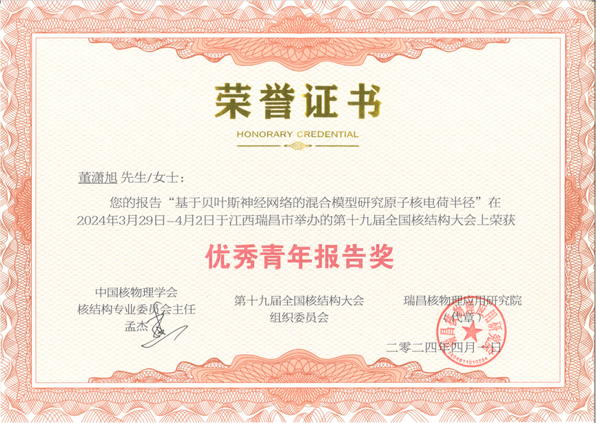 2024年4月1日,在江西瑞昌举办的第十九届全国核结构大会上,必赢76net线路官网博士研究生董潇旭因其所作报告——“基于贝叶斯神经网络的混合模型研究原子核电荷半径”,获得中国核物理学会核结构专业委员会颁发的“优秀青年报告奖”。在报告中,他首次提出了输入重排方法,根据所研究课题的先验知识重新构建了贝叶斯神经网络的结构,从而增强了贝叶斯神经网络在特定任务中的学习能力,第一次将理论模型对中重原子核电荷半径的全局描述与预测偏差降到了0.01fm左右,并准确预测了各种奇异的演化行为。