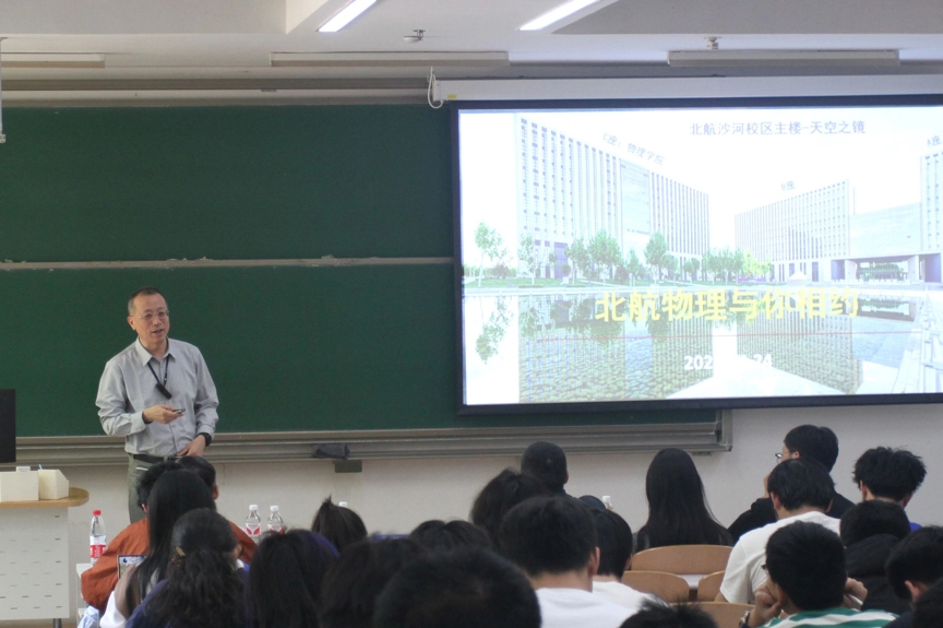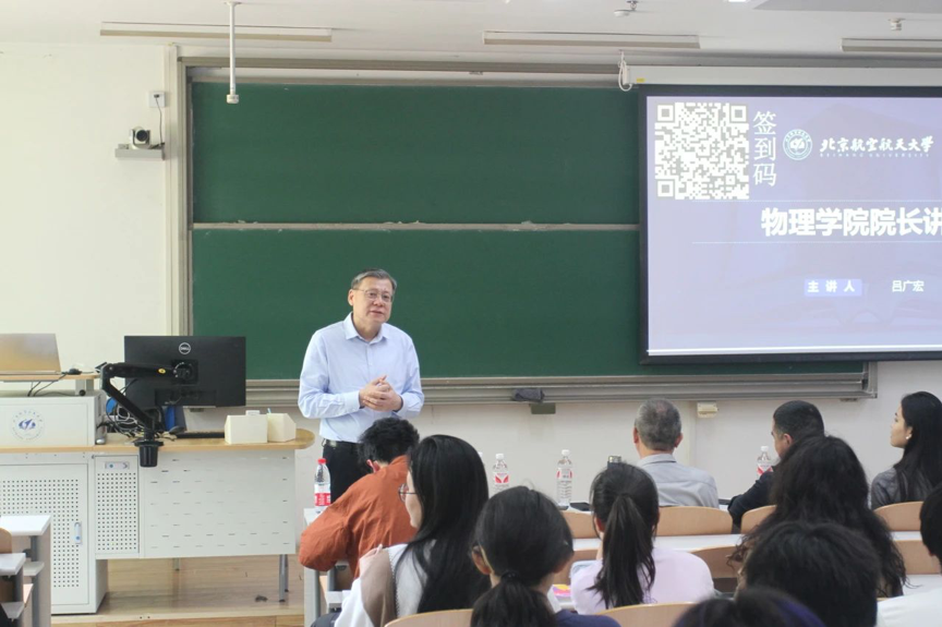 首先,吕广宏院长讲解了北航物理学科的历史沿革,介绍了必赢76net线路官网发展历史脉络中的物理教研室、物理系、必赢76net线路官网三个阶段,从中详细地介绍了闻诗先生、程先安先生等几代物理人对我校物理学科建设所做出的贡献,向同学们传达了北航物理学科“尚德务实、求真拓新、追求卓越、甘于奉献”的精神传承。