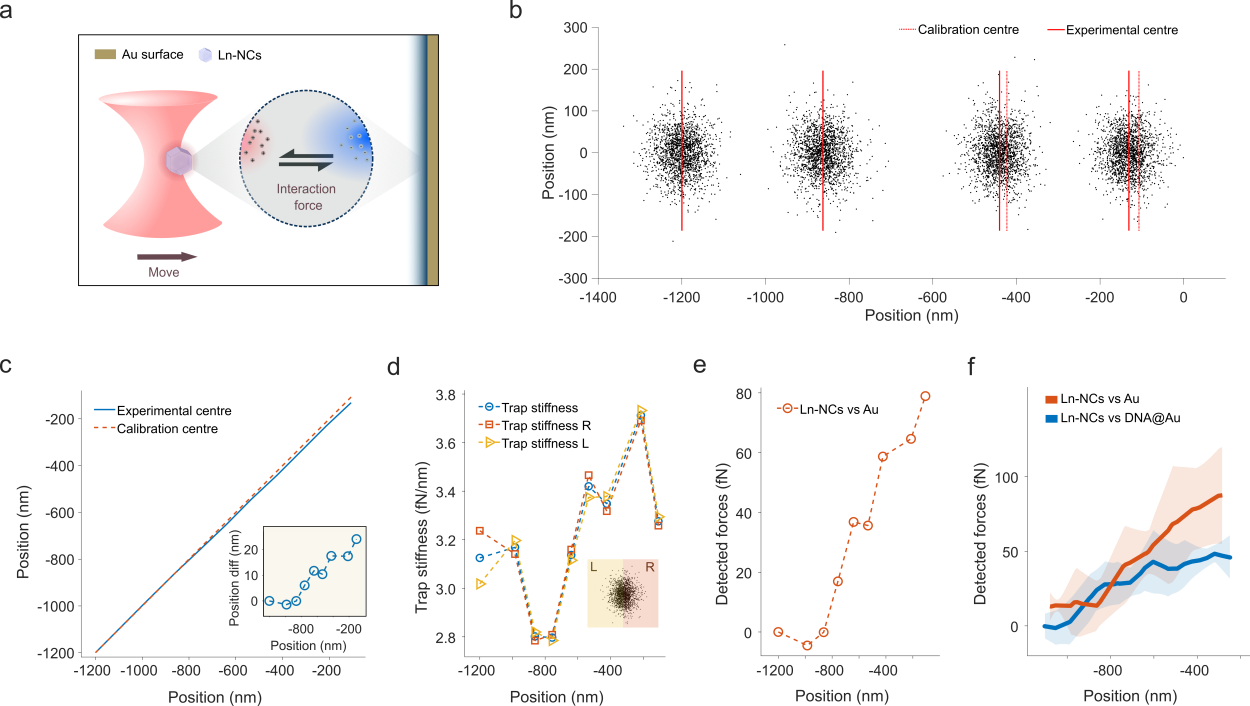 研究人员在此研究基础上,进一步研究了单纳米颗粒对金膜的相互作用力。在研究中发现,当光镊操控纳米粒子靠近金膜的过程中会受到反方向的阻力(图3c),这一微小的推力会随着纳米粒子的靠近而增强,这一作用力应该是激光散射造成的。此外,使用DNA修饰金膜之后,纳米粒子所受的平均反向推力从80飞牛降低到约40飞牛(图3f)。该实验表明在水溶液中纳米颗粒与DNA分子是具长程作用力的。该技术为探究生理环境中生物分子的长程相互作用提供了有效的工具。王帆教授课题组后续将使用该技术进行DNA链相互作用、以及CRISPR与DNA分子相互作用的力学研究。欢迎有相关研究兴趣的老师讨论合作。