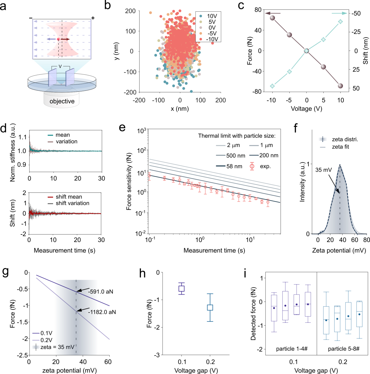 图2. a, 在均匀电场中测量被捕获单个纳米粒子的电场力的示意图。