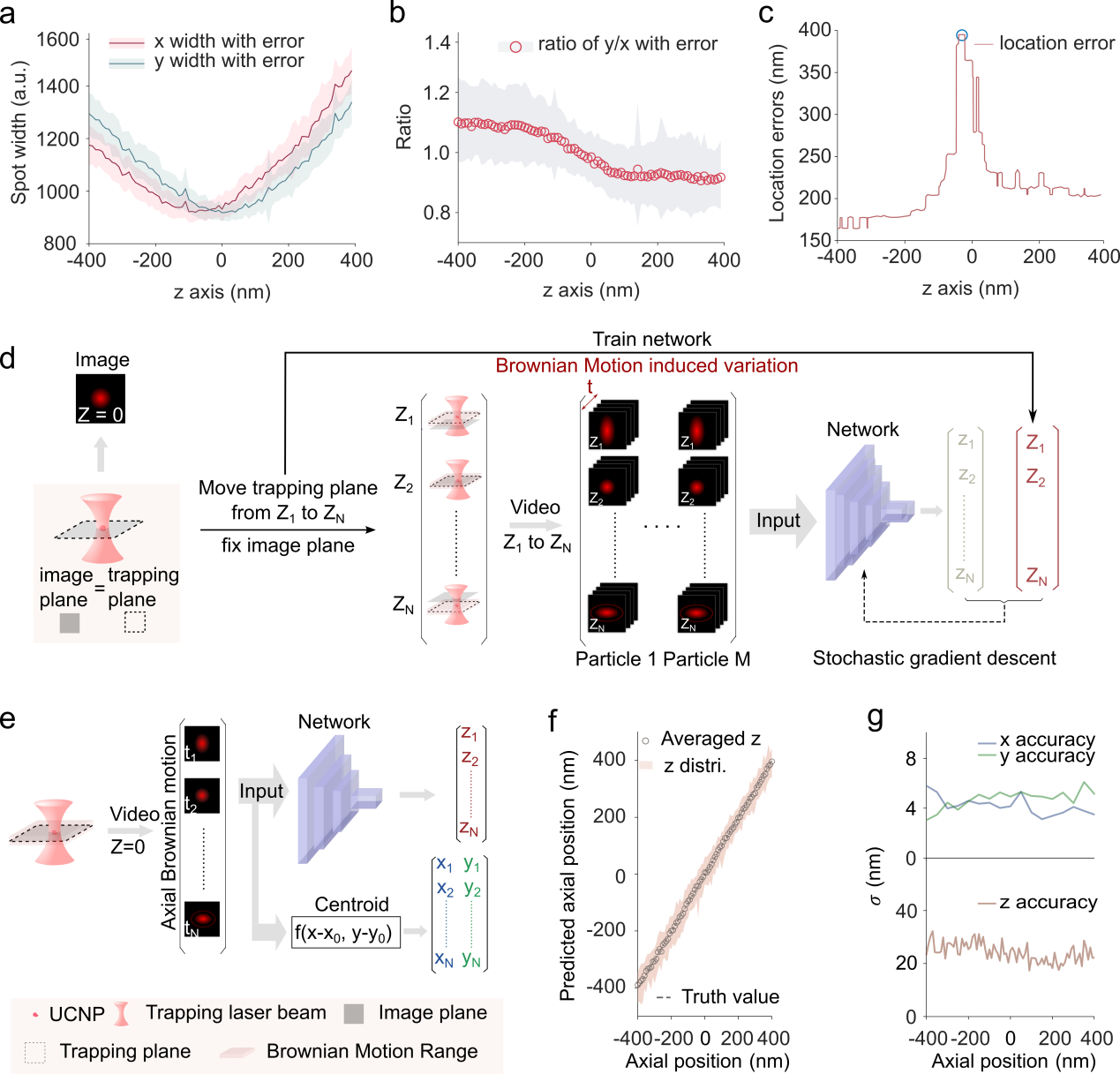 在此工作中研究人员进行理论分析。发现低势阱刚度、高定位精度与多定位数据可以提升测力精度。径向平面的定位通过荧光质心的概率分布中心得到。此外,引入了超分辨率成像中柱透镜的定位方法得到了更多的轴向信息,使得z方向精确定位过程可以经过神经网络训练得到(图1),补齐了三维测力的最后一块拼图。