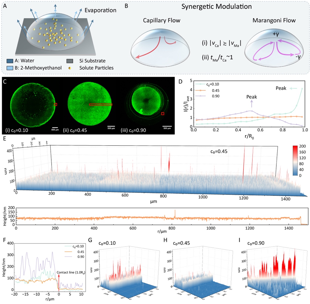 本研究提出的基于马兰戈尼效应的协同调控策略具有独特优势:通过蒸发诱导的溶剂浓度梯度产生马兰戈尼流,仅需调节二元液滴的初始体积比即可精确控制液滴内部的流场强度,无需复杂的化学改性/修饰或严苛的环境条件。这一研究为喷墨打印、微纳器件制造和生物医药等领域的图案化均匀沉积提供了简单可靠的解决方法,在规模化生产和实际应用中展现出重要价值。