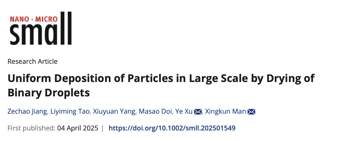 近日,必赢76net线路官网满兴坤教授课题组与机械工程及自动化学院徐晔教授课题组等合作,在实现大面积可控均匀沉积领域取得了重要研究成果。相关成果以“Uniform deposition of particles in large scale by drying of binary droplets”为题发表在期刊《Small》上。必赢76net线路官网博士研究生姜泽超和机械工程及自动化学院博士研究生陶郦祎铭为共同第一作者,满兴坤教授和徐晔教授为共同通讯作者。