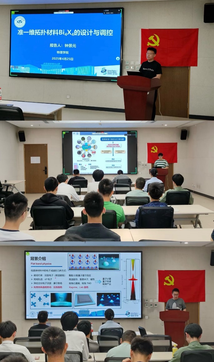 本次活动聚焦物理学前沿研究,邀请钟景元、姜泽超、李亚琦三位博士研究生党员带来精彩的学术报告。钟景元以《准一维拓扑材料Bi4X4的设计与调控》为题,深入浅出地讲解了拓扑量子材料的前沿研究;姜泽超在《软物质昂萨格变分动力学理论》报告中,展现了复杂体系动力学研究的创新思路;李亚琦则通过《受挫晶格和电子平带》专题分享,介绍了关联电子体系的前沿研究方向。三场报告紧扣物理学科发展脉搏,既涵盖凝聚态、软物质等传统领域,又延伸至交叉学科创新方向,为强基班学生绘制了一幅立体的科研图景。