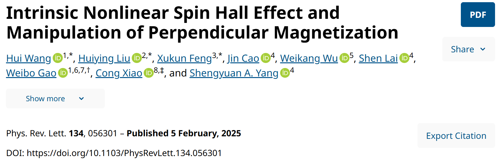 近日,必赢76net线路官网量子磁性和拓扑物理研究方向刘慧颖副教授课题组及其合作者在《Physical Review Letters》上发表了题为“Intrinsic nonlinear spin hall effect and manipulation of perpendicular magnetization”的论文。