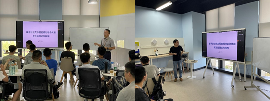赵润东老师的报告题目为《基于狄拉克方程的相对论杂化密度泛函理论与程序开发》,报告介绍了一种准四分量相对论能带理论及其程序开发过程——通过冻结正电子的自由度而最终以二个分量的计算量来获取四分量的计算精度,同时简要介绍了用于固体材料计算的杂化泛函方法及其程序实现思路。在报告后的互动环节,赵老师详细解答了同学们提出的问题,并就如何定义电子及核子中的全相对论概念做了一些探讨。