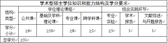 本学科学术型硕士研究生要求的知识和能力结构由学位理论课程和综合实践环节两部分构成,如下表所示。知识和能力结构主要体现对研究生业务理论素质、科学及人文素质、实践能力素质、创新意识素质等培养层次,要取得相关学位的研究生必须按培养方案获得表中所规定的各部分学分及总学分。