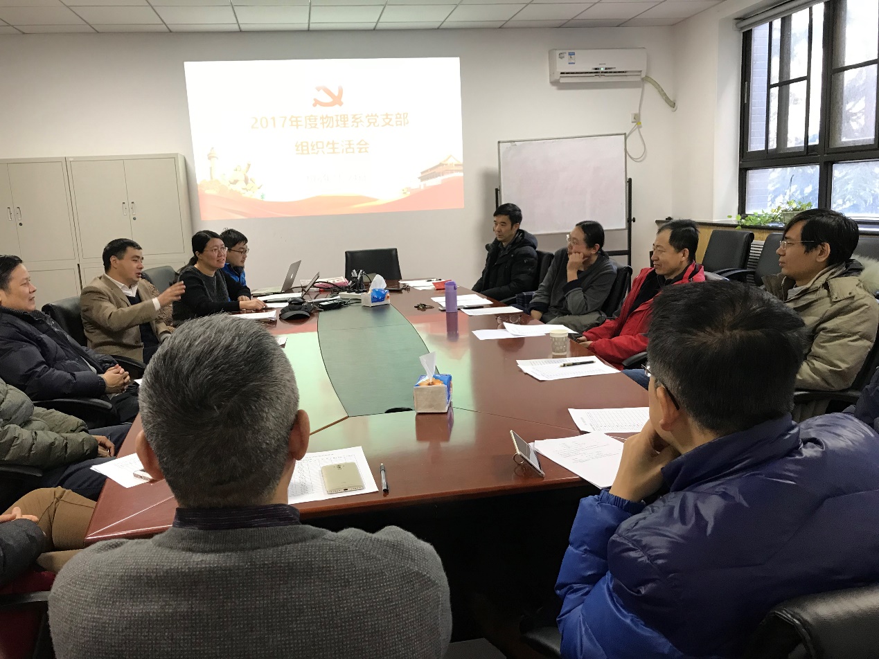 会议由物理系党支部书记金硕主持。首先,金硕书记传达了学校关于召开2017年度组织生活会和开展民主评议党员几个问题的通知,并代表党支部班子对2017年度的工作做了概括总结,对支部书记年终述职工作及院党委的会议精神进行了简短的汇报。随后支部党员依次发言,主要围绕着自身学习党的十九大报告和党章的情况以及在两学一做中的表现,特别针对自身存在的不足,联系思想工作实际进行了问题查摆和纠正,开展了批评与自我批评。每位支部党员同志都非常认真地进行了准备,将自身学习体会、查摆重点和批评与自我批评等方面进行了详尽的总结,并提交了书面材料,未能到会的同志们也提交了自己的发言材料,请支委代为汇报。