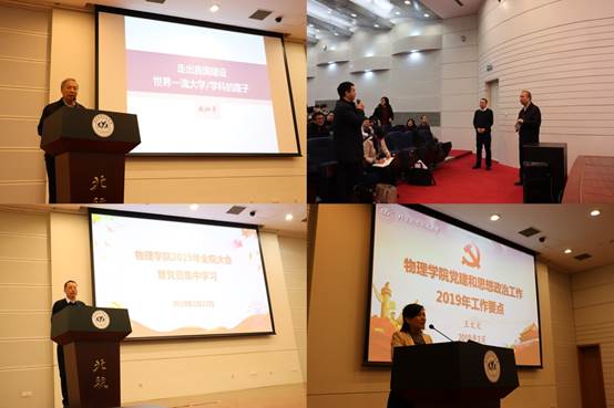 会上,吕广宏院长从学院学科总体规划、必赢76net线路官网沙河校区搬迁计划、人才培养、师资队伍与人才引育、科学研究与国际合作、学院文化建设等方面对2019年工作计划做了报告。党委书记王文文同志汇报了学院党委2019年党建和思政工作计划(征求意见稿)。她指出,2019年是中华人民共和国成立70周年,是深入学习贯彻落实全国教育大会精神的开局之年,是学校扎实推进“十三五”规划和“双一流”建设的关键之年,也是必赢76net线路官网建院10周年和进驻沙河校区的第一个年头。学院党委将贯彻上级和学校党委各项决策部署,围绕立德树人核心任务,凝心聚力,科学谋划,抢抓机遇,创新超越,推进3个层面、8个方面、33项具体工作,不断提升师生的获得感、幸福感和安全感,带领全体师生向着一流物理学科和人才培养基地的目标迈进,为学校“双一流”建设作出新贡献。