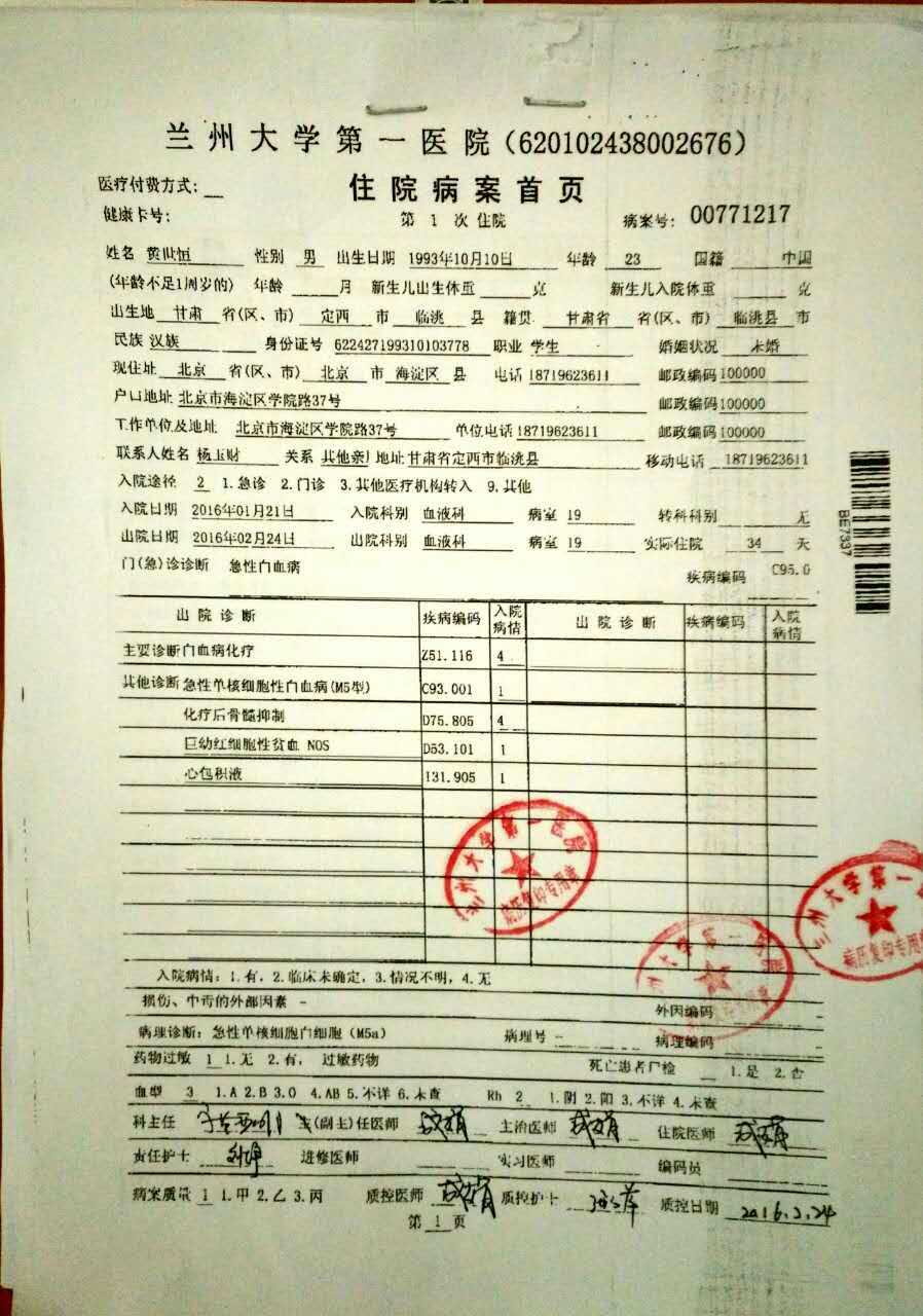 黄世恒,我校物理科学与核能工程学院2015届本科毕业生,毕业后回到家乡甘肃兰州一直准备攻读研究生。2016年2月,经诊断,他不幸患上急性单核细胞白血病,目前在兰州大学第一医院接受治疗。