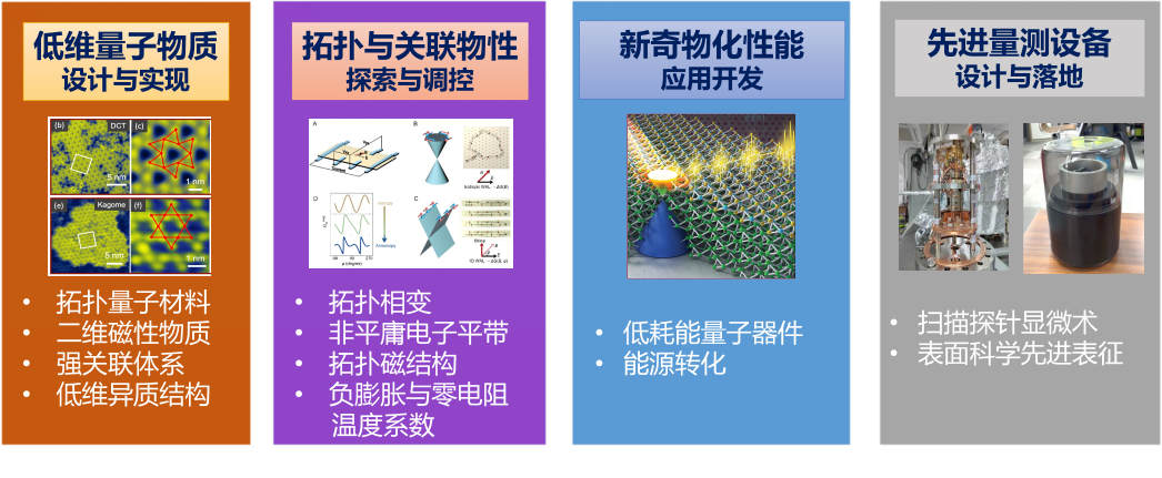 本方向聚焦低维量子物质的起源机制、电子相互作用规律与可控量子态构筑,面向量子阻挫体系、拓扑量子物态、二维磁性、强关联体系和先进量子表征技术等关键前沿问题,在原位、超高真空、低级温、强磁场下实现超高空间分辨、超高能量分辨、超快时间分辨的先端研究能力,形成具有辨识度的“表面与低维量子物理”科研方向。通过持续优化学科结构,本方向已构建以拓扑量子物态、二维磁性与自旋织构、量子几何与强关联调控、量子界面催化物理、低维量子器件物理为核心的优势体系,打造基于表面物理的国际前沿量子高峰方向。依托团队长期积累的MBE–STM/qPlus–ARPES–PPMS–同步辐射全链条实验体系,以及TB/DFT/Monte Carlo等量子理论与计算手段,形成理论–计算–实验一体化的量子物质研究架构,实现从“原子级设计与制造—量子态构建与相互作用调控—器件开发与验证”的全流程贯通。本方向着力推动表面与低维物理与工程、先进材料、量子传感与量子信息等领域的深度交叉,构建“量子物理×先进仪器”双驱动模式。依托自主研发的扫描探针显微镜、原位光谱、极端环境物性测量平台,开展原位调控(电场、磁场、应变、温度)下的多场耦合研究。同时,本方向建设了高水平的先进分析测试平台和科研仪器工程化基地,推动科研成果与仪器平台“双轮驱动”发展,形成贯通本科—硕士—博士的人才培养体系,为建设国际领先的表面与低维量子物理学科提供持续动力。