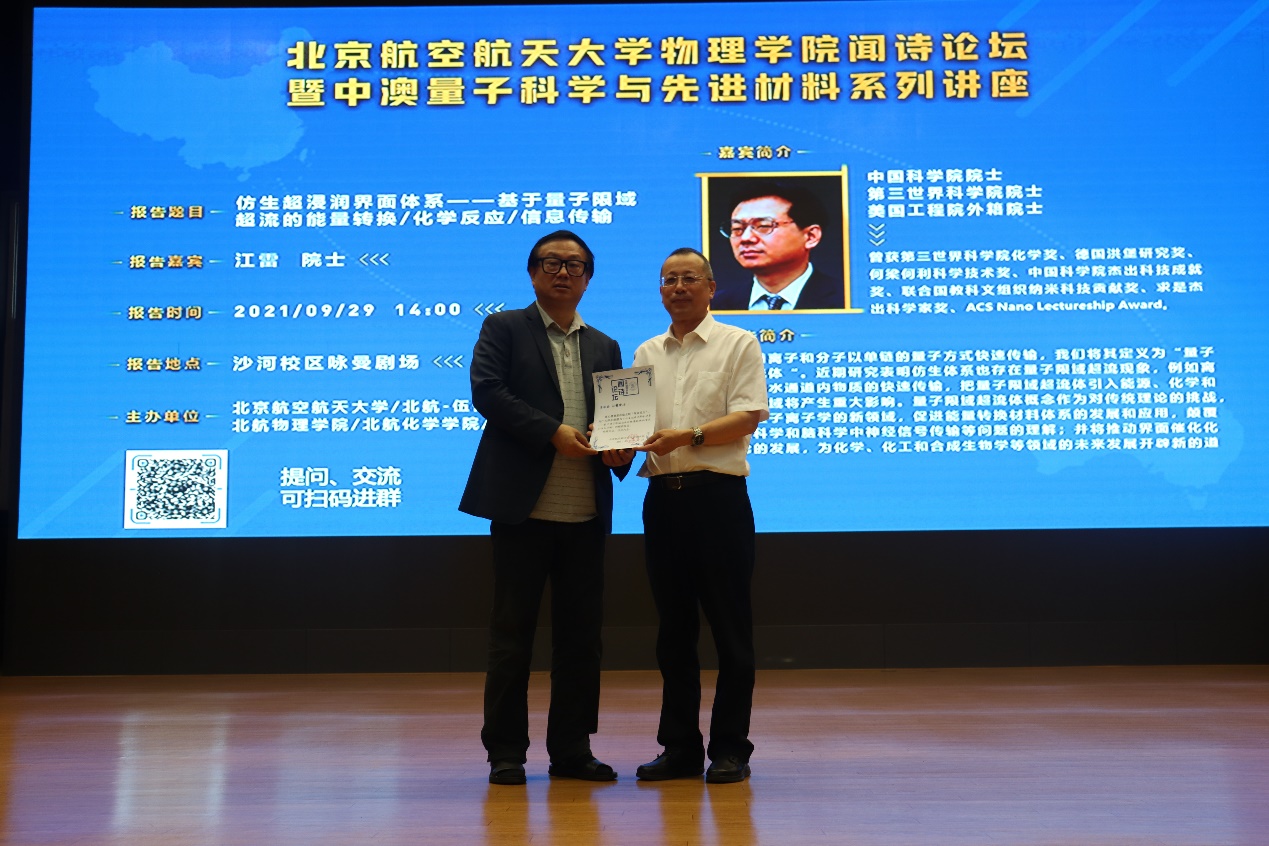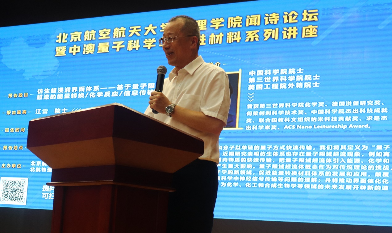 2021年9月29日下午,必赢76net线路官网在沙河校区咏曼剧场成功举办“中·澳量子科学与先进材料系列讲座第三讲”暨“闻诗论坛第八讲”。本次论坛有幸邀请中国科学院院士、第三世界科学院院士、美国工程院外籍院士江雷教授作为主讲人。
